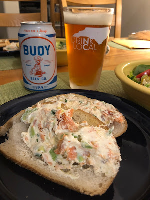 I served the spread atop toasted sourdough, with a Buoy beer (of Astoria, OR) for Scott, along with a salad of greens, cucumber, tomato and Riverhouse Cheddar & Chive dressing (of Tillamook, OR). Fresh, creamy textured, and quick to prepare - I'll make this again, probably for a party or holiday gathering.